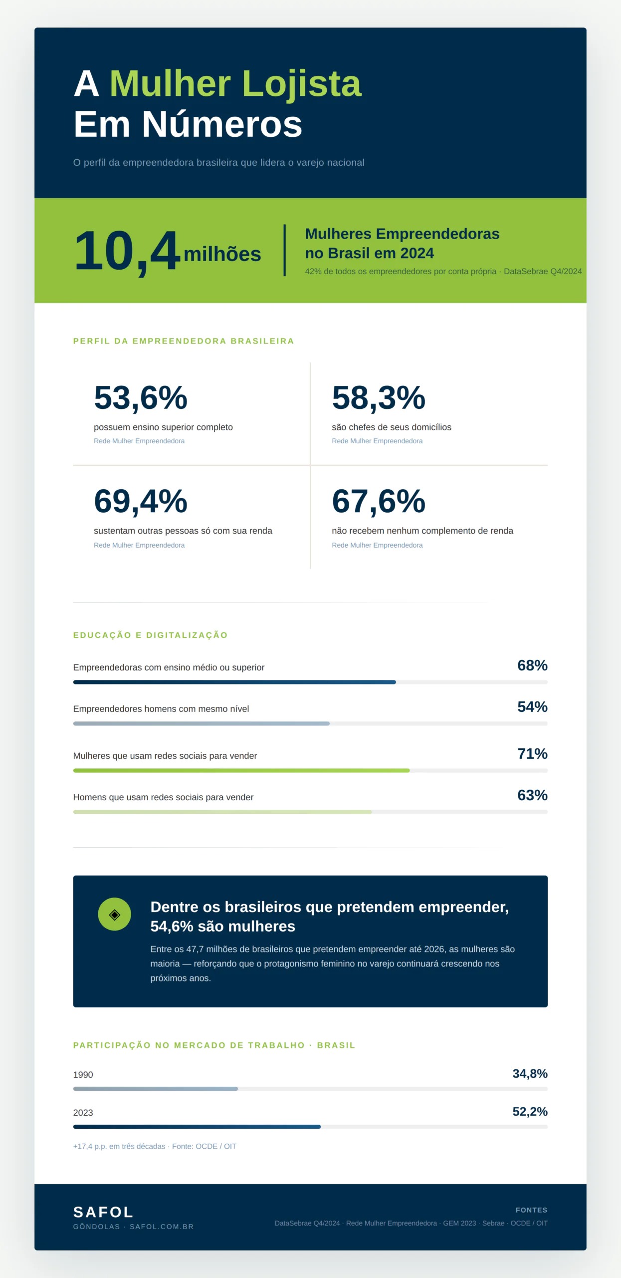 No Brasil, a taxa de participação feminina passou de 34,8% em 1990 para 52,2% em 2023, tendo atingido 54,3% em 2019, antes da pandemia. O cenário demonstra uma transformação estrutural no perfil do mercado — e o comércio é um dos principais motores dessa mudança.